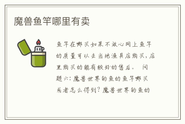 如果不放心網上魚竿的質量可以去當地漁具店購買,店里購買的能有較好的售后。 問題六:魔獸世界釣魚的魚竿哪買 或者怎么得到? 魔獸世界釣魚的魚竿 荊棘谷釣魚大賽獎勵個+30的魚竿, 和一個可以水下呼吸的東西。如果參加的人不多, 你。