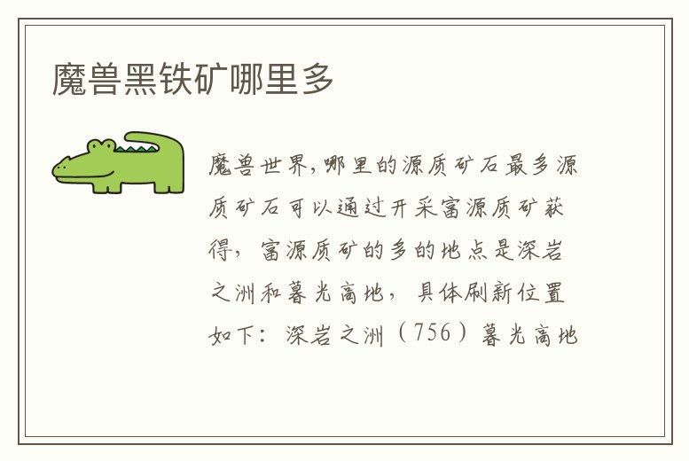 網友分享:魔獸世界黑鐵礦石多又好挖:MC里面,輕松挖,數量多又沒人打擾,然后就是黑石深淵,點少了點,不過一個小時刷個5次,大概也能挖到2組左右的黑鐵礦。野外的話就灼熱之地和燃燒平原有少量刷新。