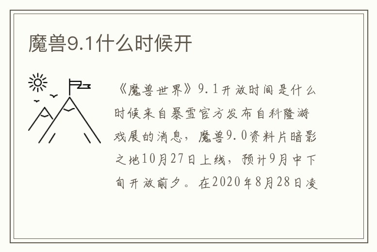 來自暴雪官方發布自科隆游戲展的消息,魔獸9.0資料片暗影之地10月27日上線,預計9月中下旬開放前夕。在2020年8月28日凌晨舉行的科隆游戲展開幕活動中,暴雪娛樂公開了一段《魔獸世界》“暗影之地”系列動畫第一篇。另外官方。