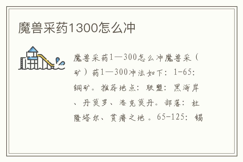 網(wǎng)友分享:按以上順序基本上可以保證在10個(gè)小時(shí)左右讓采藥技能達(dá)到300。聯(lián)盟草藥學(xué)快速?zèng)_300路線(xiàn):一:初級(jí)拔草工的耳邊風(fēng)。出了鐵爐堡,遍地野草,隨便拔。1小時(shí)內(nèi),沖頂至技能75。產(chǎn)草品種:寧神花,銀葉草(拔草等級(jí)1)地根草(15)。
