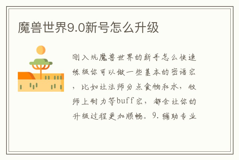 聯盟方快速升級路線:1-10級去鐵爐堡后山,10-20級去死亡礦井,20-30級去暴風城監獄,30-45級去血色,45-58級去STSM。部落方快速升級路線:1-8級自行任務,8-15級去怒焰峽谷,15-25級去影牙城堡,25-45級去血色。