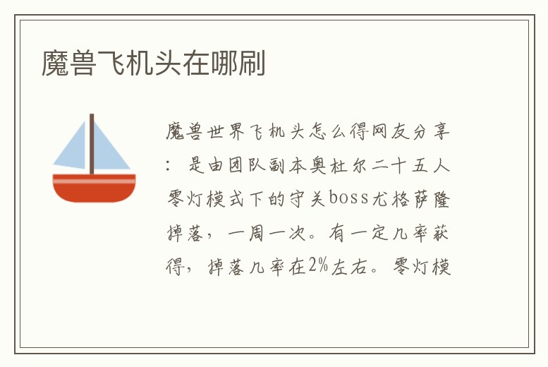 網友分享:現在飛機頭也就是【米米爾隆的頭部】只能是尤格薩隆掉落了,跟成就無關,只是小概率掉落,話說我一個哥們帶了3把橙錘了還沒見到飛機頭,非常浮云的掉率啊 以上全部手打,如果對樓主有幫助請采納,謝謝 。