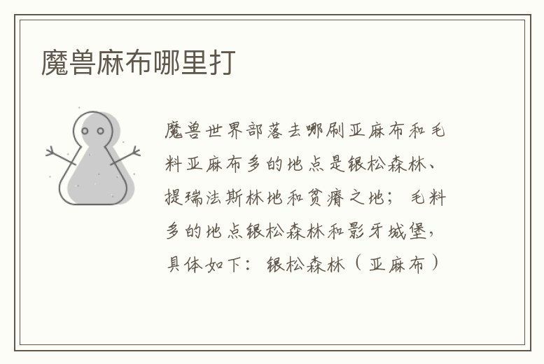 掉落亞麻布的地點是銀松森林、提瑞法斯林地和貧瘠之地;毛料多的地點銀松森林和影牙城堡,具體如下來:銀松森林(亞麻布)源 提瑞法斯林地(亞麻布)貧瘠之地(亞麻布)銀松森林(毛料)影牙城堡(毛料)。