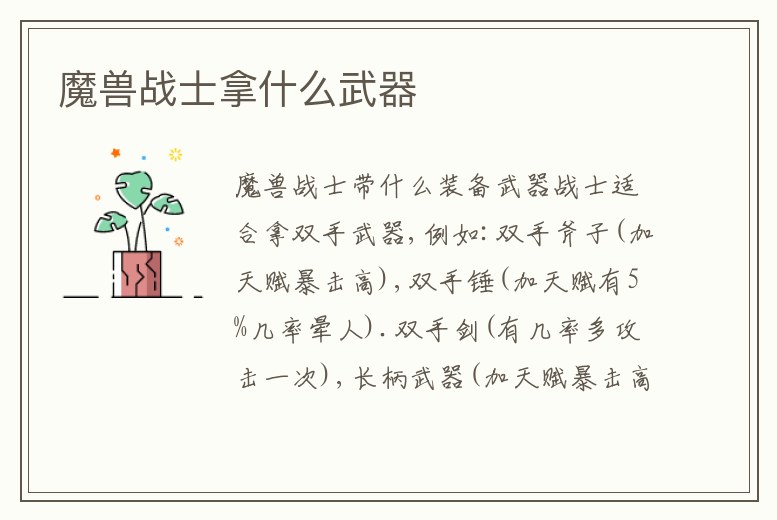 網友分享:武器戰士適合拿雙手武器,例如:雙手斧子(加天賦暴擊高),雙手錘(加天賦有5%幾率暈人).雙手劍(有幾率多攻擊一次),長柄武器(加天賦暴擊高)狂暴戰士適合拿雙持,建議主手拿2.5~3.0的單手武器,副手拿1.5~2.0的武器 防護。