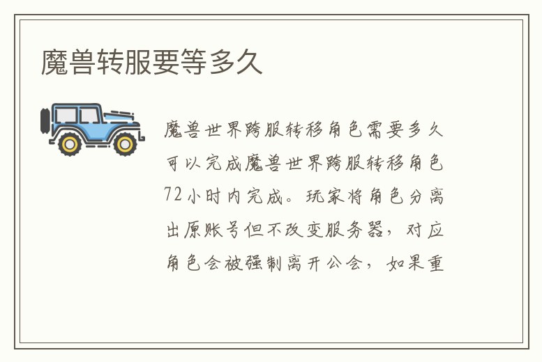 問題一:魔獸世界轉服要多久 1:如果轉入服務器有相同ID的玩家,那肯定是強制后來者改名,無論對方是聯盟還是部落。所以只要名字一樣,肯定會改名成功。2:轉只需要24小時,雖然官網是說72小時,不過一般情況下24小時就可以。