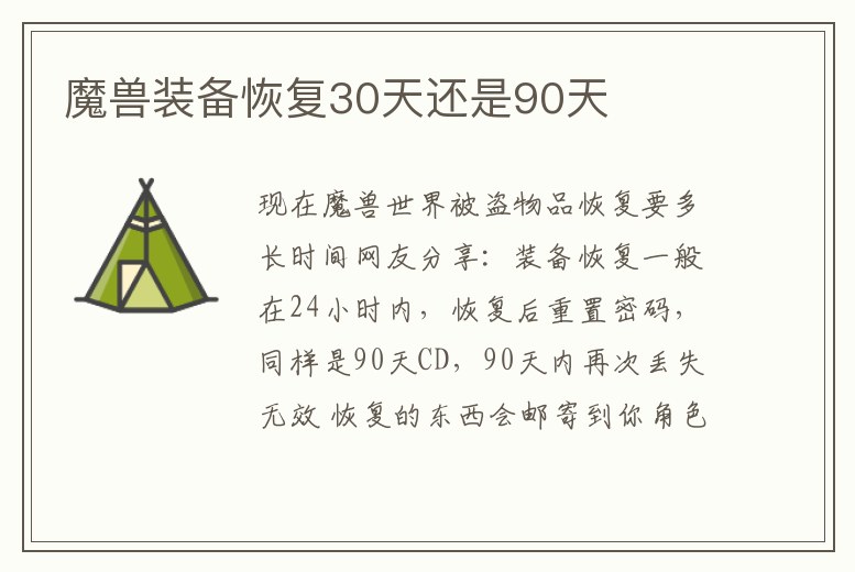 網友分享:裝備恢復一般在24小時內,恢復后重置密碼,同樣是90天CD,90天內再次丟失無效 恢復的東西會郵寄到你角色的郵箱,郵件為明顯的暴雪標示,存在90天,推薦徹查損失之后再要求恢復,否則可能會不受理 。
