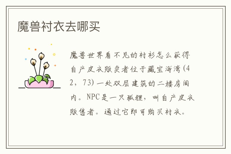 自產(chǎn)皮衣販賣者位于藏寶海灣(42,73)一處雙層建筑的二樓房間內(nèi)。NPC是一只狐貍,叫自產(chǎn)皮衣販?zhǔn)壅摺Mㄟ^它即可購買襯衣。《魔獸世界》(WorldofWarcraft)是由著名游戲公司暴雪娛樂所制作的第一款網(wǎng)絡(luò)游戲,屬于大。