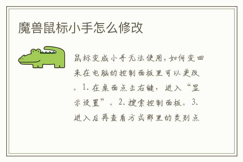 在電腦的控制面板里可以更改。在桌面點擊右鍵,進入顯示設置。搜索控制面板。進入后在查看方式處,尋找類別,點擊后換成小圖標。進去后點擊鼠標。如果鼠標樣式是別的圖案的話,點擊方案,再點擊Windows默認的。