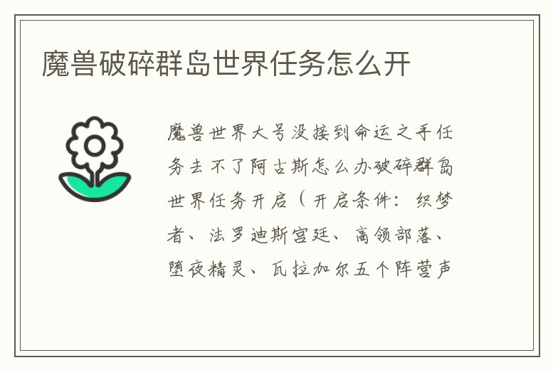 破碎群島世界任務開啟(開啟條件:織夢者、法羅迪斯宮廷、高領部落、墮夜精靈、瓦拉加爾五個陣營聲望達到友善以上。)完成破碎海灘的場景戰役任務到達破碎海灘。滿足以上兩個條件的玩家,回到達拉然后就會自動觸發命運之手任。