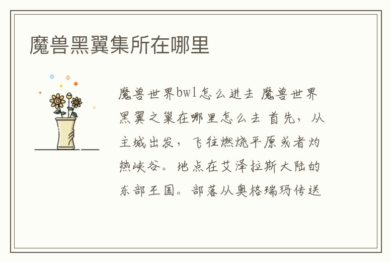 黑翼在黑石塔上邊,所以要做任務才能傳上去,還有個方法是進黑石塔上層(副本名字,簡稱黑上),黑上有黑翼的入口。黑石塔在燃燒平原與灼熱峽谷交界。黑上,又灼熱那邊進黑石塔,進門口后直走,向左轉,有條大鎖鏈,跳。