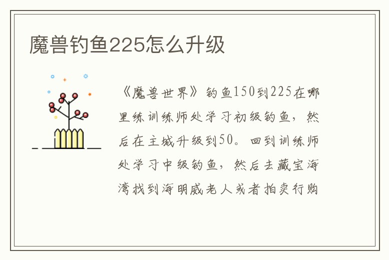釣魚150到225在濕地、荊棘谷、藏寶海灣等地河邊。魔獸玩家的釣魚等級到達150級后,需要去東部王國荊棘谷的藏寶海灣的NPC老人海明威處,花費1G購買中級釣魚教材鱸魚與你,學習之后提升釣魚等級上限就能提升到225了,然后去濕地的。