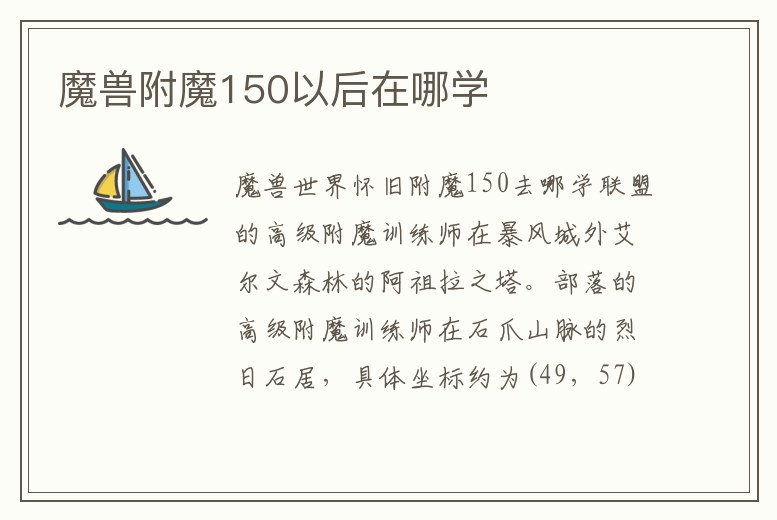 聯(lián)盟的高級附魔訓練師在暴風城外艾爾文森林的阿祖拉之塔。部落的高級附魔訓練師在石爪山脈的烈日石居,具體坐標約為(49,57)。魔獸世界懷舊服中附魔是一項非常有用的技能,可以給裝備武器附上效果提高屬性。附魔150級之后需。