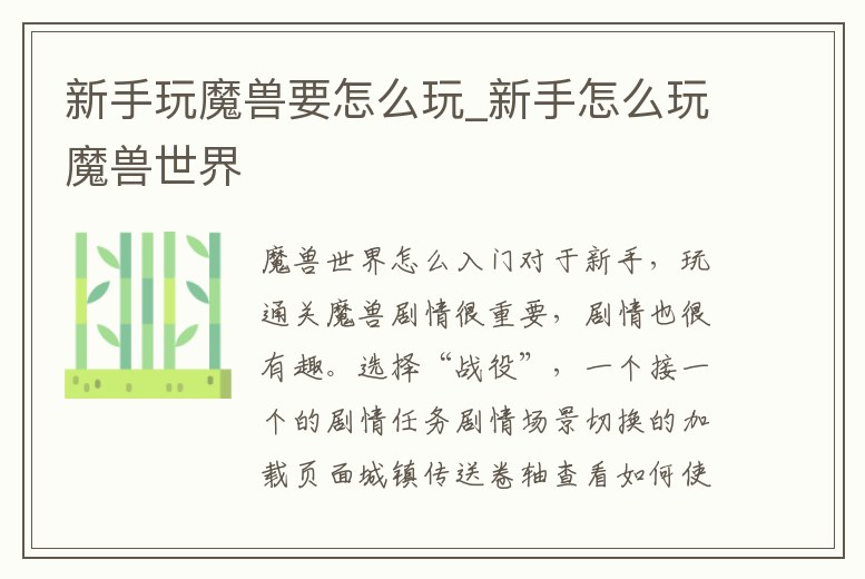 新手玩魔獸要怎么玩_新手怎么玩魔獸世界