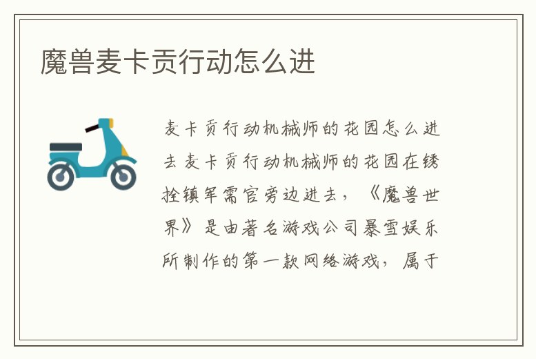 麥卡貢行動機械師的花園在銹拴鎮軍需官旁邊進去,《魔獸世界》是由著名游戲公司暴雪娛樂所制作的第一款網絡游戲,屬于大型多人在線角色扮演游戲。游戲以該公司出品的即時戰略游戲《魔獸爭霸》的劇情為歷史背景,依托魔獸爭霸的歷史。