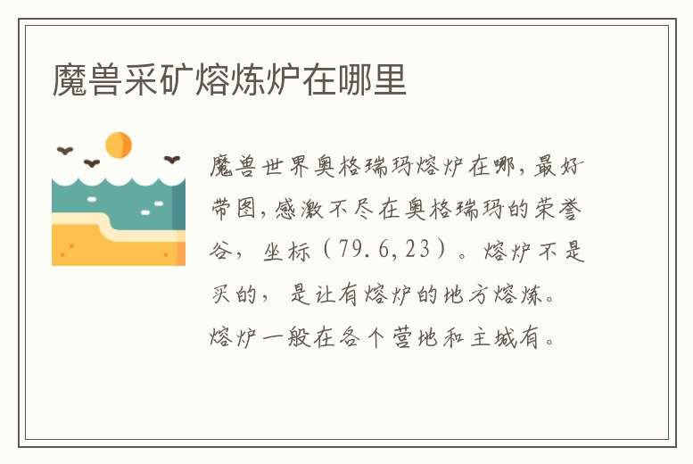 在奧格瑞瑪?shù)臉s譽谷,坐標(79.6,23)。熔爐不是買的,是讓有熔爐的地方熔煉。熔爐一般在各個營地和主城有。鼠標放上去會在左下角出現(xiàn)文字“熔爐”一般在武器商,板甲商,鍛造商,采礦供應商的房間或者旁邊會有熔爐。主城。