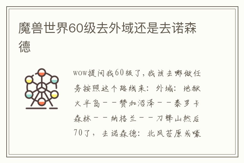 wow提問我60級了,我該去哪做任務(wù)按照這個路線來:外域:地獄火半島--贊加沼澤--泰羅卡森林--納格蘭--刀鋒山然后70了,去諾森德:北風(fēng)苔原或嚎風(fēng)峽灣--龍骨荒野--灰熊丘陵--祖達(dá)克--索拉查盆地--風(fēng)暴峭壁或冰冠