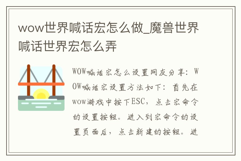 網友分享:WOW喊話宏設置方法如下:首先在wow游戲中按下ESC,點擊宏命令的設置按鈕。進入到宏命令的設置頁面后,點擊新建的按鈕。進入新建的頁面后,選擇一個宏的表示的圖標。然后為選擇好的宏的圖標,進行命名。在。