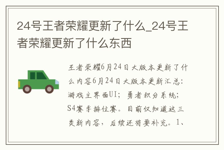 王者榮耀6月24日大版本更新了什么內容6月24日大版本更新匯總:游戲主界面UI;勇者積分系統;S4賽季排位賽。目前僅知道這三類新內容,后續還將要補充。1、王者榮耀2017年1月24日版本更新內容介紹此次將會有