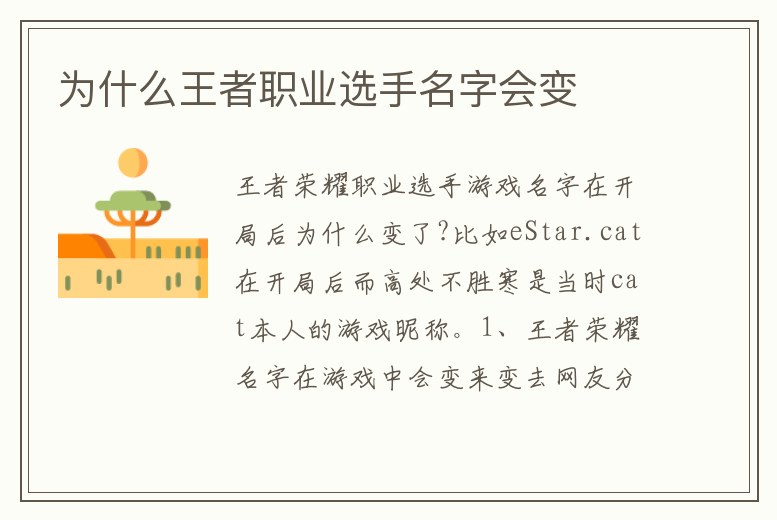 王者榮耀職業選手游戲名字在開局后為什么變了?比如eStar.cat在開局后而高處不勝寒是當時cat本人的游戲昵稱。1、王者榮耀名字在游戲中會變來變去網友分享:不會的,改一個名字需要改名卡,而充點券買一張改名卡很貴的90點券就是9元錢。2、好友王者戰績名字總變什么原因好友王者戰績名字總變是因為她把自己的游戲id更改了,在王者里面不僅好友的頭像、備注是不一樣的,而且連昵稱也不能一樣,這