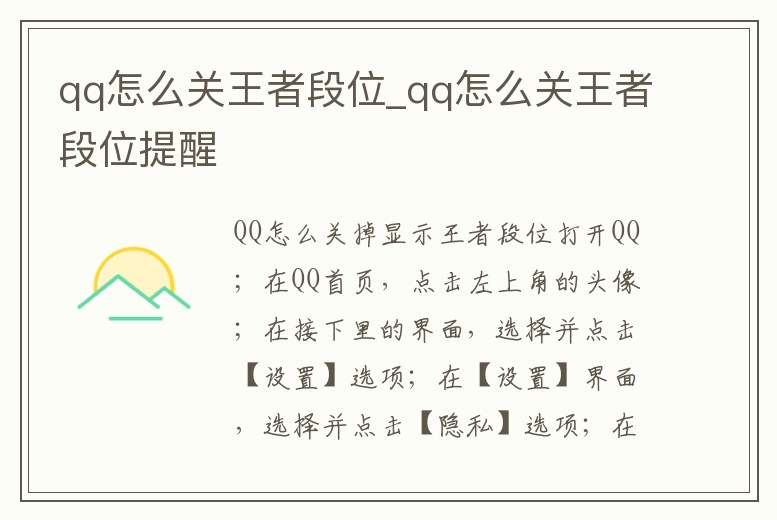 QQ怎么關(guān)掉顯示王者段位打開QQ;在QQ首頁,點(diǎn)擊左上角的頭像;在接下里的界面,選擇并點(diǎn)擊【設(shè)置】選項(xiàng);在【設(shè)置】界面,選擇并點(diǎn)擊【隱私】選項(xiàng);在【隱私】界面,選擇并點(diǎn)擊【我的王者榮耀段位】選項(xiàng);在接下來的界面。1、手機(jī)QQ我的王者段位如何進(jìn)行關(guān)閉我們打開QQ