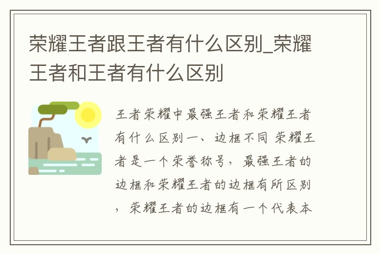 段位級別不同。最強王者是比鉆石高的一個段位,而榮耀王者則比最強王者級別高。稱號不同。最強王者是一個段位,而榮耀王者是一個榮譽稱號。邊框不同。最強王者的邊框和榮耀王者的邊框有所區別。榮耀王者的邊框有。
