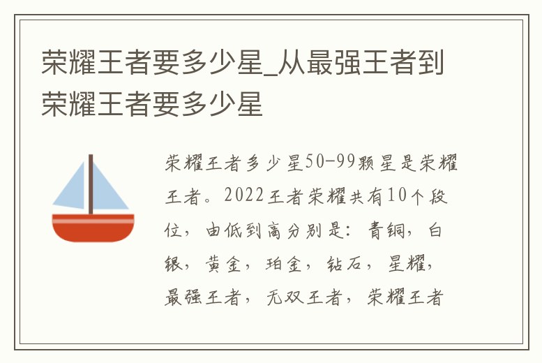50-99顆星是榮耀王者。2022王者榮耀共有10個段位,由低到高分別是:青銅,白銀,黃金,珀金,鉆石,星耀,最強王者,無雙王者,榮耀王者和傳奇王者。其中0-24星為最強王者,25-49星為無雙王者,50-99星為榮耀王者,100星。