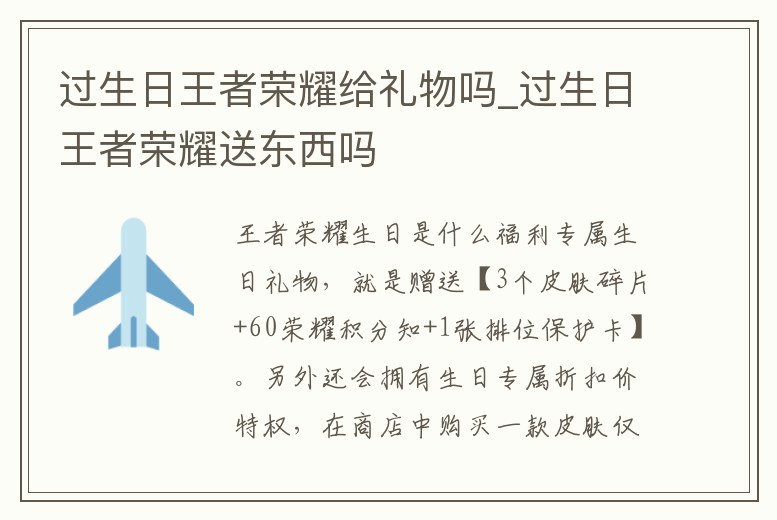 專屬生日禮物,就是贈送【3個皮膚碎片+60榮耀積分知+1張排位保護卡】。另外還會擁有生日專屬折扣價特權,在商店中購買一款皮膚僅需6折,大部分皮衜膚都能買,新出的皮膚不能買。