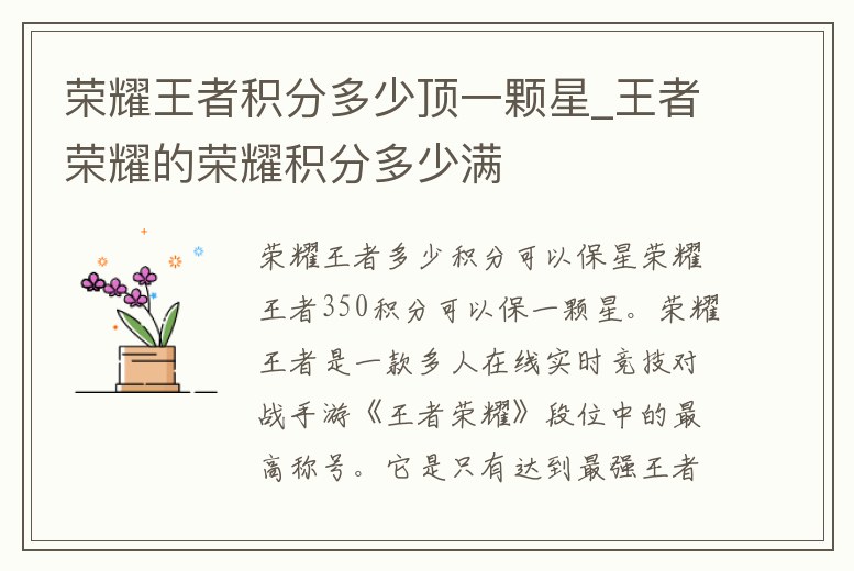 榮耀王者350積分可以保一顆星。榮耀王者是一款多人在線實時競技對戰手游《王者榮耀》段位中的最高稱號。它是只有達到最強王者段位的玩家才能獲得的榮譽。每日凌晨12點,最強王者達到50星即升級成為榮耀王者。設定:游戲正式服(安。