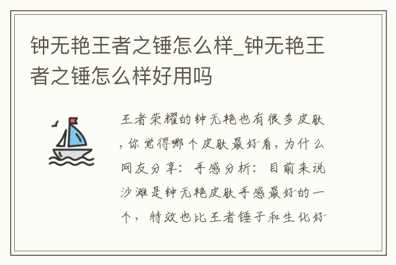 網友分享:手感分析:目前來說沙灘是鐘無艷皮膚手感最好的一個,特效也比王者錘子和生化好看,不過模型依然比較丑。二、王者之錘:賞金賽限定皮膚,一次賞金聯賽累計獲勝10次就可以獲得,這個皮膚比較看運氣,隊友如果一直掛機就不容易刷皮。
