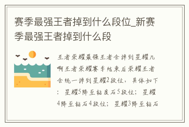 王者榮耀賽季結束后榮耀王者會統一掉到星耀2段位,具體如下:星耀5降至鉆度石5段位;星耀4降至鉆石4段位;星耀3降至鉆石4段位;星耀2降至鉆石3段位;星耀2降至鉆石3段位;最強王知者0-9星降至鉆石2段位;最強王者10-1。