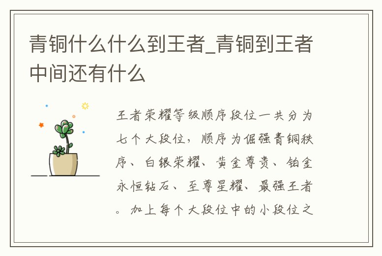 截止至2022年3月19日《王者榮耀》版本,段位等級如下:青銅段位:青銅三、青銅二、青銅一;白銀佰段位:白銀三、白銀二、白銀一;黃金段位:黃金四、黃金三、黃金二、黃金一;鉑金段位:鉑度金四、鉑金三、