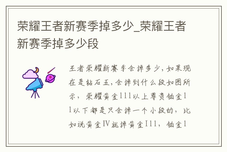 星耀3和星耀2掉6個段位。星耀1掉5個段位,就是一個大段位。王者0-9星掉到鉆石2。9、王者10-19掉到鉆1。10、王者20-29掉到星耀5。1王者30-39掉到星耀4。1王者40-49掉到星耀3。1王者50-999。
