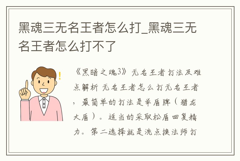 黑魂三無名王者弱什么?黑魂3中無名王者是十分強力的boss,部分玩家不知道這個boss的弱點,下面就簡單的分享一下這個boss的弱點。黑魂三無名王者弱什么在黑暗之魂三游戲中無名王者有兩種形態,騎龍形態弱雷,抗火、出血、毒。