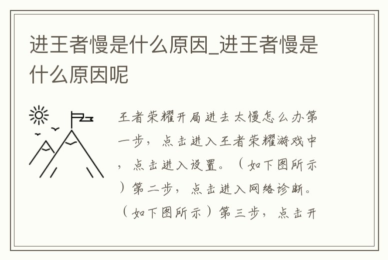 第一步,點擊進入王者榮耀游戲中,點擊進入設(shè)置。(如下圖所示)第二步,點擊進入網(wǎng)絡(luò)診斷。(如下圖所示)第三步,點擊開啟優(yōu)化網(wǎng)絡(luò)即可解決王者榮耀開局進去太慢的問題。(如下圖所示)以上就是王者榮耀開局進去太慢怎么辦。