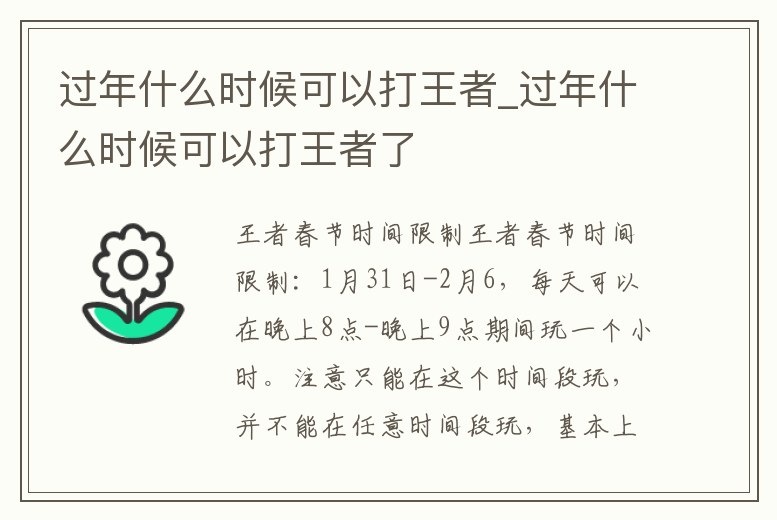 王者春節時間限制:1月31日-2月6,每天可以在晚上8點-晚上9點期間玩一個小時。注意只能在這個時間段玩,并不能在任意時間段玩,基本上吃完年夜飯后,就能打開游戲玩一個小時了。21年春節是可以玩三個小時的,但是在21。
