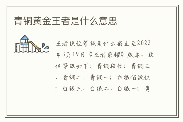截止至2022年3月19日《王者榮耀》版本,段位等級如下:青銅段位:青銅三、青銅二、青銅一;白銀佰段位:白銀三、白銀二、白銀一;黃金段位:黃金四、黃金三、黃金二、黃金一;鉑金段位:鉑度金四、鉑金三、