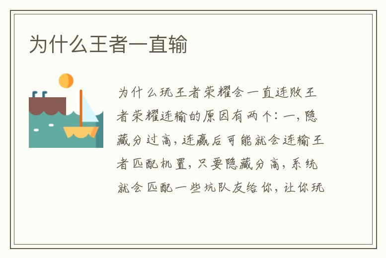 王者榮耀連輸?shù)脑蛴袃蓚€: 一,隱藏分過高,連贏后可能就會連輸 王者匹配機置,只要隱藏分高,系統(tǒng)就會匹配一些坑隊友給你,讓你玩的哭笑不得,我也有過這樣的經(jīng)歷,先連勝好幾把,然后怎么打都會輸,氣得我想刪除 游戲 ,后來了解后才明。