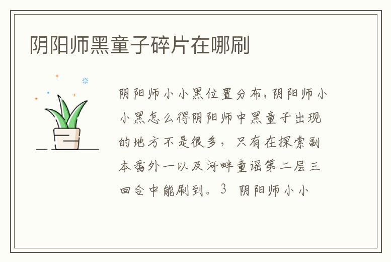 陰陽師中黑童子出現(xiàn)的地方不是很多,只有在探索副本番外一以及河畔童謠第二層三回合中能刷到。3 陰陽師小小黑位置分布 探索副本 番外一 見習(xí)鬼使 首領(lǐng):黑童子 鬼使白×1鬼使黑×1黑童子×1天邪鬼綠。