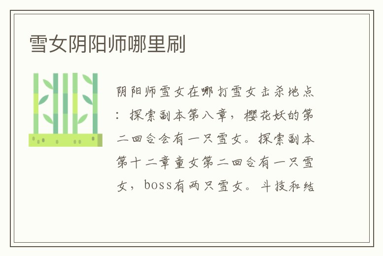 雪女擊殺地點:探索副本第八章,櫻花妖的第二回合會有一只雪女。探索副本第十二章童女第二回合有一只雪女,boss有兩只雪女。斗技和結界突破遇到也算 以上就是小編為大家帶來的陰陽師雪女哪里多的相關介紹,希望對。