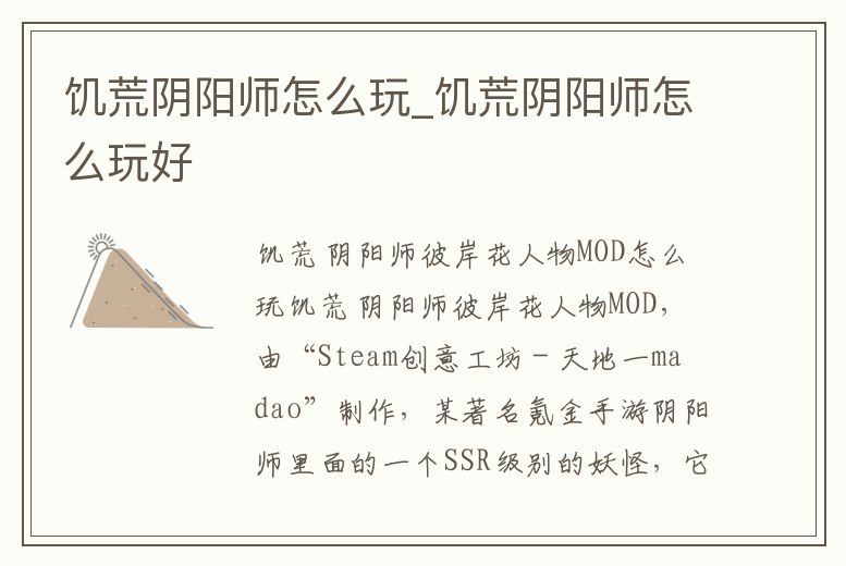 饑荒 陰陽師彼岸花人物MOD,由“Steam創(chuàng)意工坊 - 天地一madao”制作,某著名氪金手游陰陽師里面的一個(gè)SSR級(jí)別的妖怪,它肯定是沒有妖刀強(qiáng)的,不過她也有自己特別的能力你可以好好探索一下,本站提供饑荒陰陽師彼岸花人物MOD,