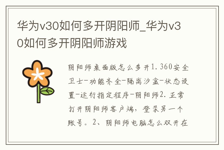 華為v30如何多開陰陽師_華為v30如何多開陰陽師游戲