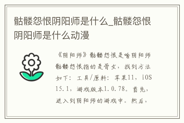 答案:骷髏+怨恨指的就是骨女了。骨女,是網易公司研發的3D日式和風回合制RPG手游《陰陽師》中的SR式神之一;她原本其實也只是個普通的女子;面容冷峻的她,擁有一段悲慘的過去;她強迫自己不去回憶那些事情,但那些痛苦如同。