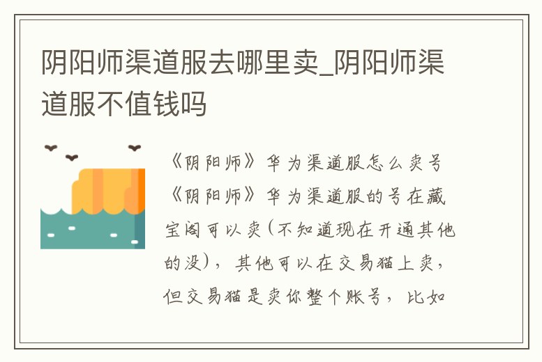 《陰陽師》華為渠道服的號在藏寶閣可以賣(不知道現在開通其他的沒),其他可以在交易貓上賣,但交易貓是賣你整個賬號,比如華為賬號,OPPO賬號。如果你真的要賣號的話一定要小心,這些買賣游戲賬號的商家很多都是騙子。一定要。