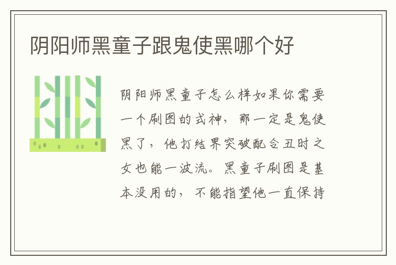 如果你需要一個刷圖的式神,那一定是鬼使黑了,他打結界突破配合丑時之女也能一波流。黑童子刷圖是基本沒用的,不能指望他一直保持在殘血唰唰唰唰,但以后斗技的時候用處更大一些。陰陽師黑童子和鬼使黑哪個好 /黑童子對比攻略 。