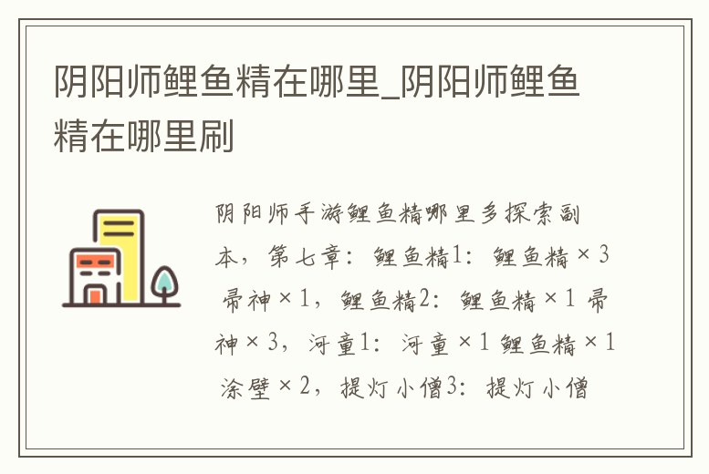 鯉魚精位置 章節:1,7章 鯉魚精1:鯉魚精x3?鯉魚精2:鯉魚精x1?河童1:鯉魚精x1?提燈小僧3:鯉魚精x2?挑戰:鯉魚精?鯉魚精x14 御魂:2,御魂2層 一回合:鯉魚精x1 3,御魂3層 二。