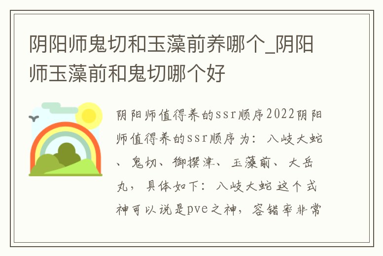 陰陽師值得養的ssr順序為:八岐大蛇、鬼切、御撰津、玉藻前、大岳丸,具體如下:八岐大蛇 這個式神可以說是pve之神,容錯率非常的高。不管你什么副本過不去,玩一個大蛇肯定是不會錯的,而且現在的八岐大蛇pvp也非常。