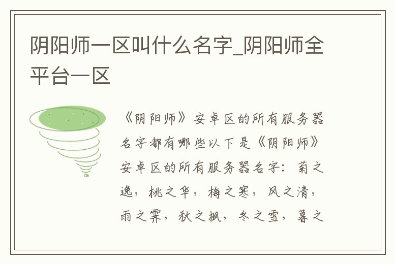 問題五:陰陽師 安卓區(qū)的所有服務器名字,就是那個,秋之楓,冬之雪什么的那個 陰陽師所有區(qū)名字大全 中國區(qū)――安卓:菊之逸,桃之華,梅之寒,風之清,雨之霽,秋之楓,冬之雪,暮之霞,雀之靈。中國區(qū)――ios:桂之馥。