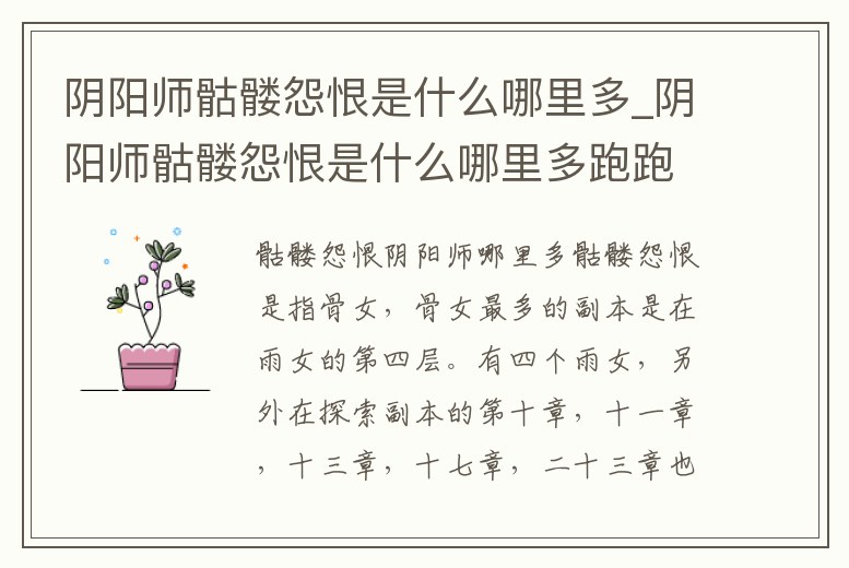 骷髏怨恨是指骨女,骨女最多的副本是在雨女的第四層。有四個雨女,另外在探索副本的第十章,十一章,十三章,十七章,二十三章也有骨女,御魂副本在第五層,第六層,妖氣封層回合三,紅葉的羈絆第五層妖刀秘技第五層,雨女。