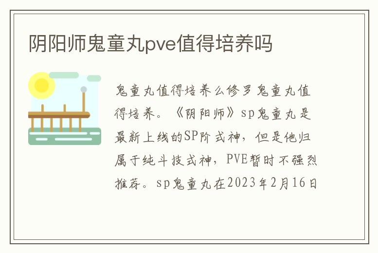 修羅鬼童丸值得培養。《陰陽師》sp鬼童丸是最新上線的SP階式神,但是他歸屬于純斗技式神,PVE暫時不強烈推薦。sp鬼童丸在2023年2月16日測試版獲得了式神調節,本次轉換方向為提升。首先是“失心”,修改后失心不被反跳、驅除。