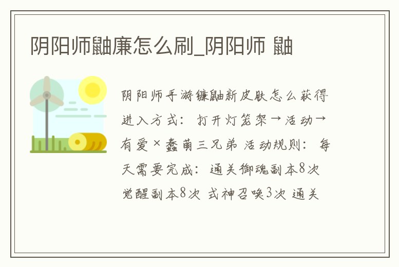 進(jìn)入方式:打開(kāi)燈籠架→活動(dòng)→有愛(ài)×蠢萌三兄弟 活動(dòng)規(guī)則:每天需要完成:通關(guān)御魂副本8次 覺(jué)醒副本8次 式神召喚3次 通關(guān)探索副本6次 拼圖總共36塊,持續(xù)16天,每天完成3項(xiàng)的話(huà)足夠獲得鐮鼬新皮膚:萌鼬童。